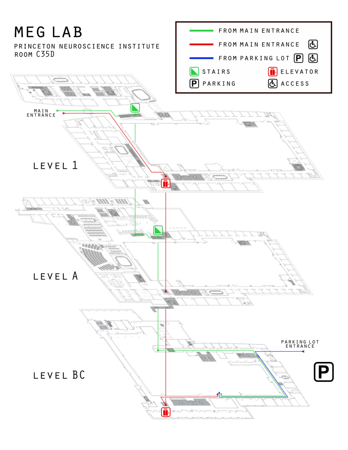 Our MEG Lab is located in room C35D, on the bottom floor of the Princeton Neuroscience Institute building. The map below has been provided for your convenience.